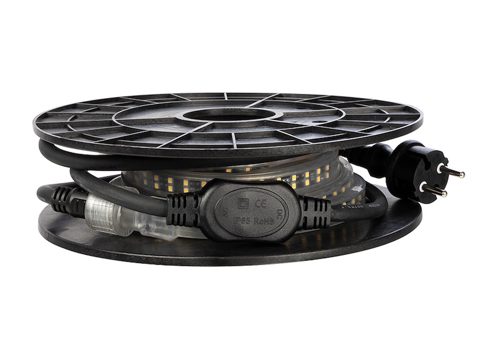 Takket være IP65-beskyttelsen kan det også bruges udenfor, f.eks. til at oplyse terrasser, gårde, marker, hegn eller husets ydervægge. Det kører på almindelig 230V strøm og har 180 LED’er pr. meter. Når lyset er slukket, falder den mørke farve diskret ind i omgivelserne.