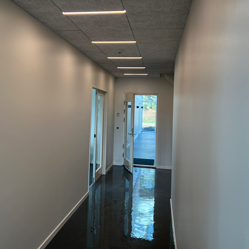 I hele firmabygningen er der valgt de unikke LED lysskinner som belysning. Ved at vælge samme lyskilde i alle rum, opnår man en rød tråd og ensartet look i hele bygningen, hvilket skaber en rolig og harmonisk stemning.