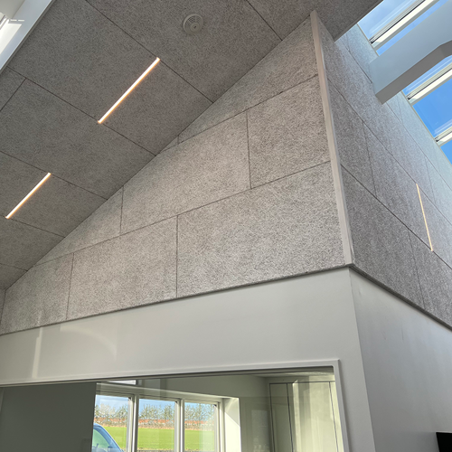 I bygningens midtergang har kreativiteten været på spil, her er lysskinnerne nemlig monteret lodret på væggene, som netop er beklædt med Troldtekt plader på den øverste del.