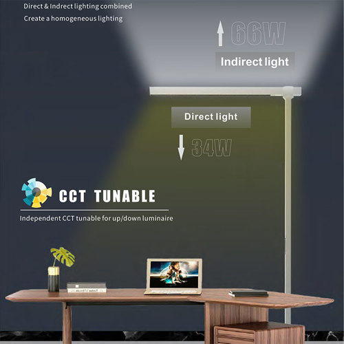 Lampen har både direkte og indirekte lys, som kan justeres uafhængigt af hinanden.