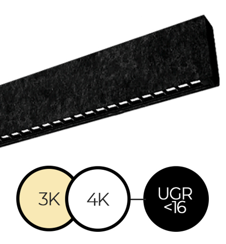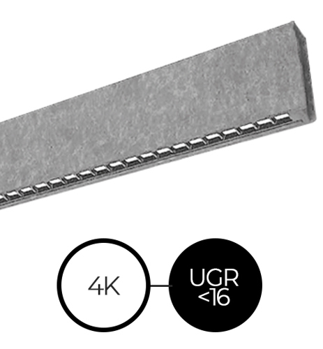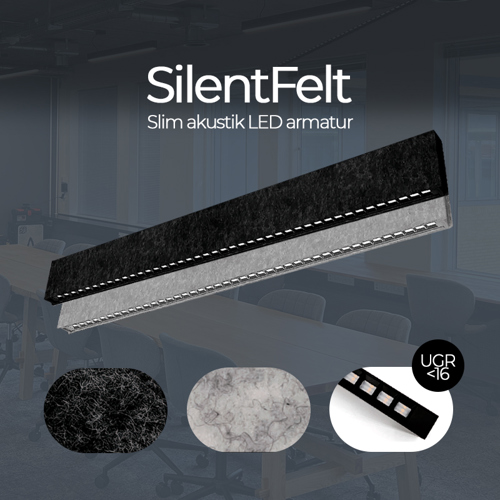 Armaturet er designet med akustisk optimeret filt for at reducere støjniveauet og skabe en behagelig atmosfære. Det filtbeklædte LED armatur fås i sort filt med hhv. 3.000 og 4.000 kelvin samt i en grå version i 4.000 kelvin. Med den lave blænding (UGR<16) sikrer lampen et blødt og komfortabelt arbejdslys.