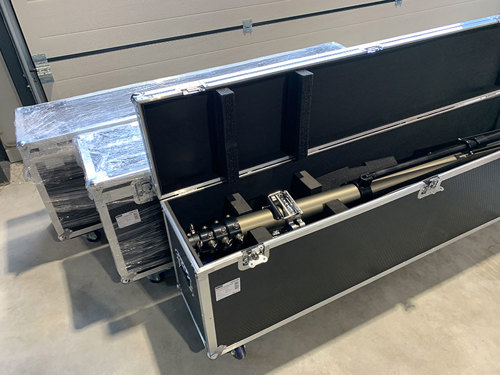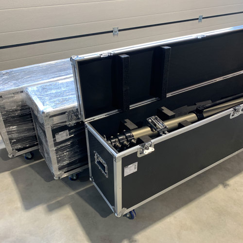 Disse flightcases indeholder sammenklappelige aluminiumsstel med hjul, som via hydraulisk hejs kan blive op til 5,4 meter højt.