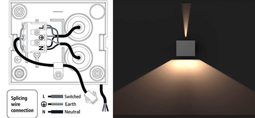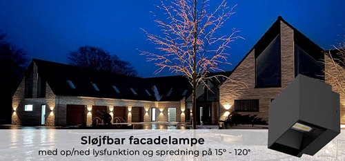 Den energibesparende facadelampe har en levetid på 50.000 timer, og er sløjfbar med 2 kabler.