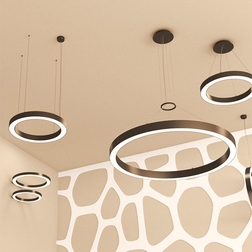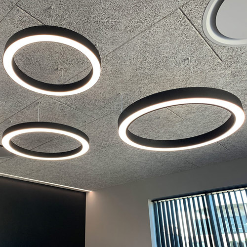 Circle lamperne monteres via stålwire, hvilket gør, at lamperne får et svævende udtryk.