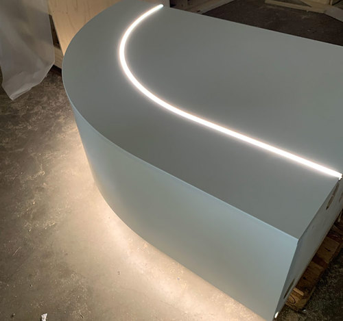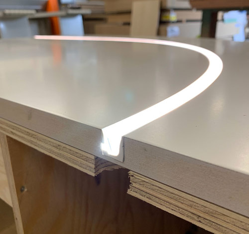 Til projektet blev der, i de firkantede silikoneprofiler, integreret omkring 50 meter LED-bånd, som skulle monteres i flere messepodier med runde hjørner.