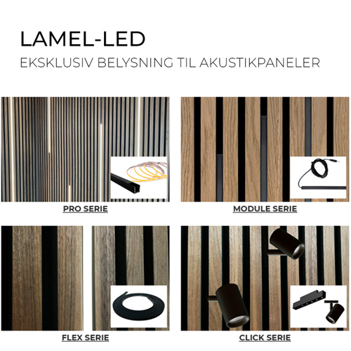 LAMEL-LED er et nytænkt belysningskoncept, som er specialudviklet af green:ID for belysning i de populære akustikpaneler. LAMEL-LED er designet til diskret integrering i filten mellem lamellerne i akustikpanelerne. Ved montering af LAMEL-LED løftes designet i akustikpanelerne og skaber nyt liv samt en perfekt atmosfære bl.a. i hjemmet, i butiks- og kontorlokaler.