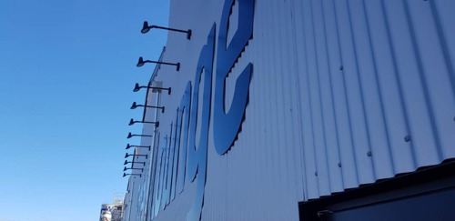 Til at oplyse det store logo på facaden, faldt valget på skilte-projektører fra green:ID.