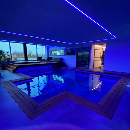 green:ID har via kunde senest leveret kvalitets RGBW strips til et større nybyggeri, hvor der flere steder er skabt unikke belysningsløsninger bl.a. i dette lækre pool-rum.