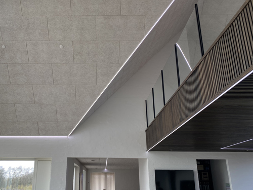 Flere steder i denne nybyggede bolig er der ligeledes anvendt green:ID LED strips, som også der er indbygget og monteret i Troldtekt-lofterne via green:ID monteringsskinner.