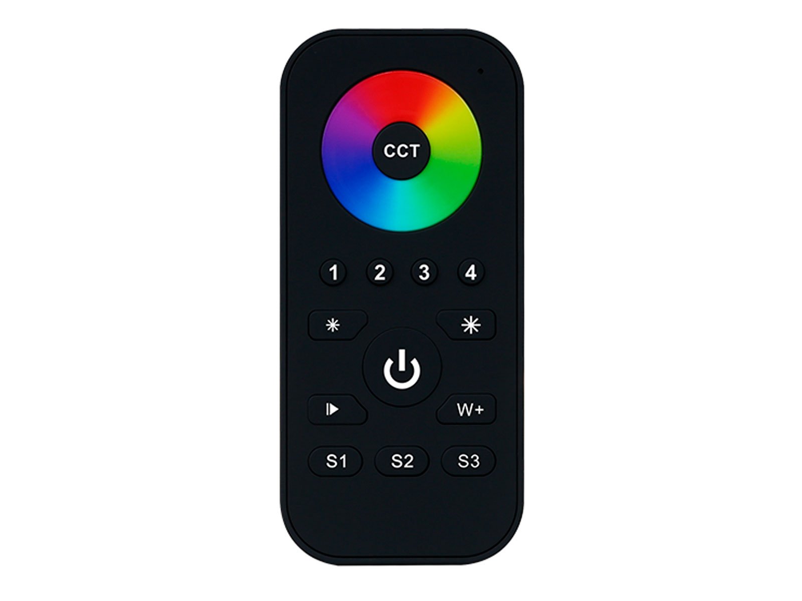 RGB+CCT-fjernbetjening med et ultrasensitivt og stabilt touch-farvehjul, der gør det muligt hurtigt og præcist at justere farvetonen. Den kan styre enkeltfarve, CCT, RGB, RGBW og RGB+CCT belysningsenheder.