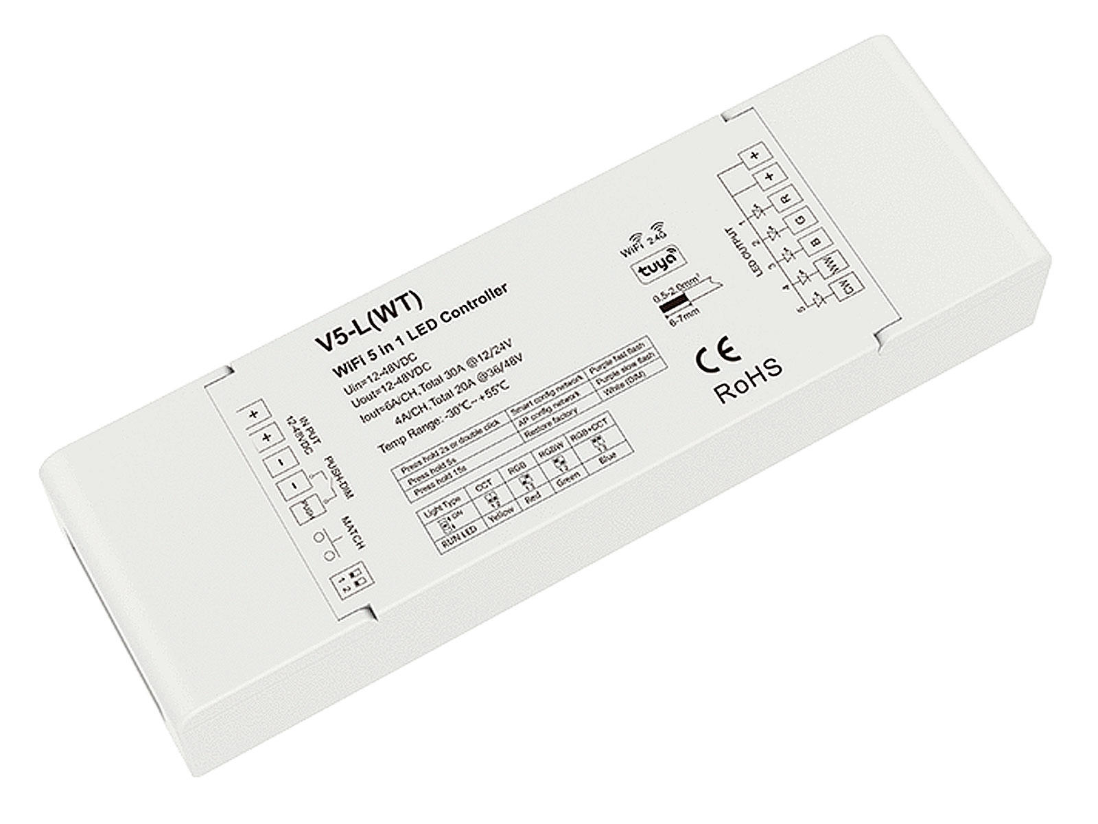 LED 5-kanals controller. WiFi Tuya + RF 2.4GHz + Push-DIM