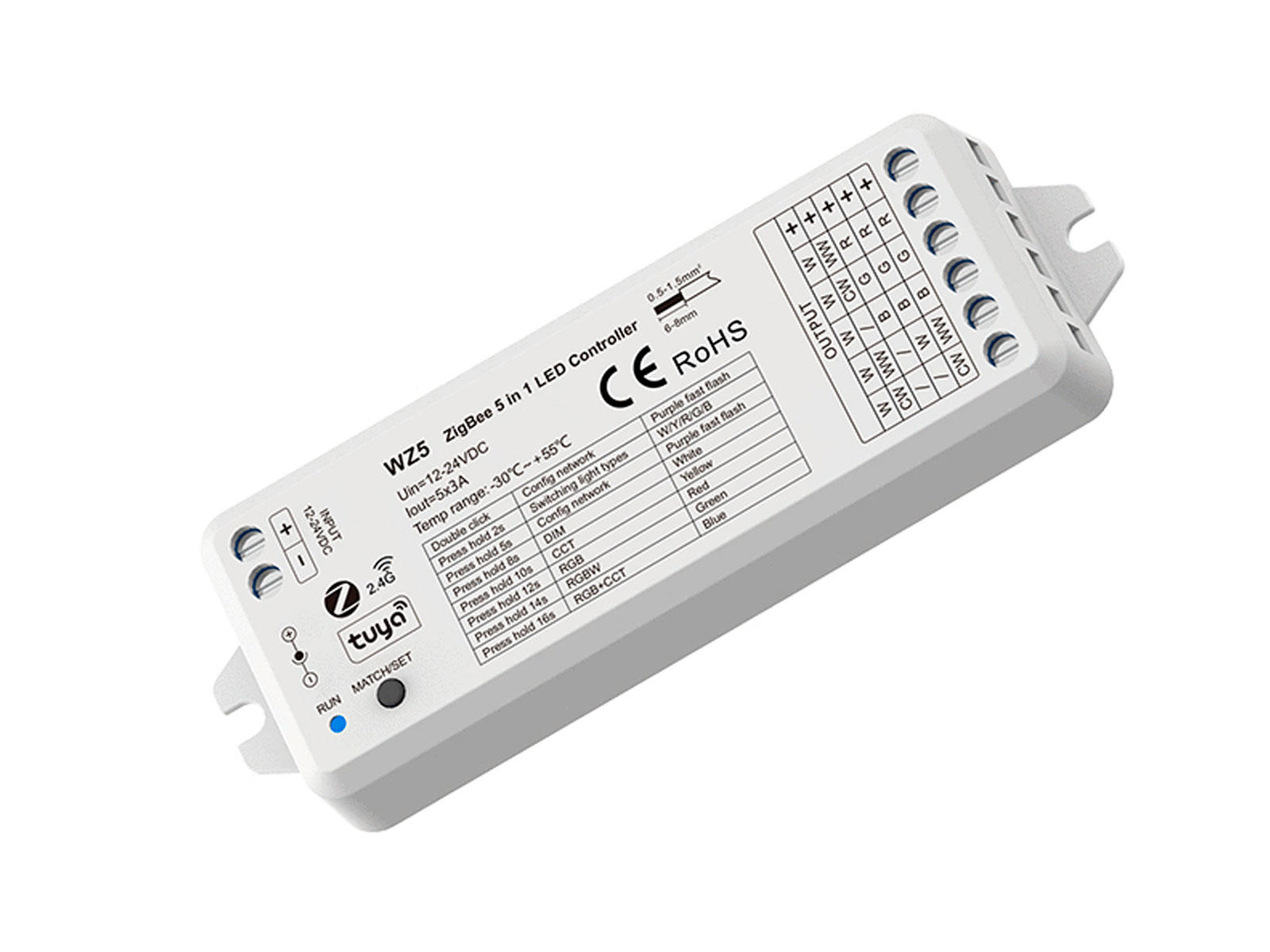 LED dimming controller RF 2.4GHz & Zigbee 3.0/Tuya. 5-kanals (RGBCTA). 12V/24V