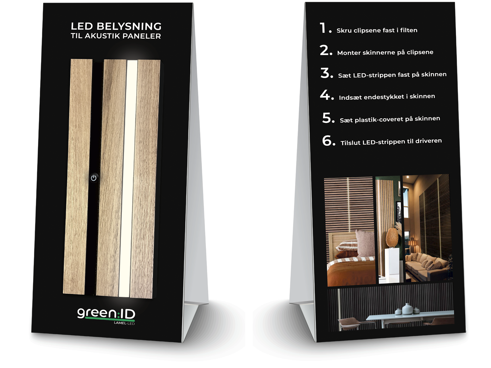 Vi tilbyder vores forhandlere af green:ID LAMEL-LED, at de gratis kan få sendt vores nye og smarte borddisplay, således de kan skabe øget fokus og attention på LAMEL-LED lysskinner i butikken.