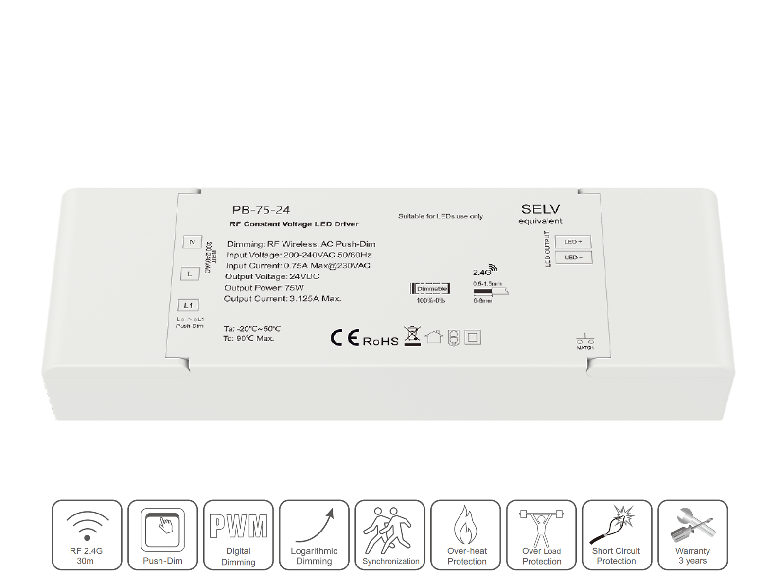 LED driver 24V 75W dæmpbar RF 2.4GHz for trådløs styring + PUSH dæmp. med AC adapter + DC adapter monteret